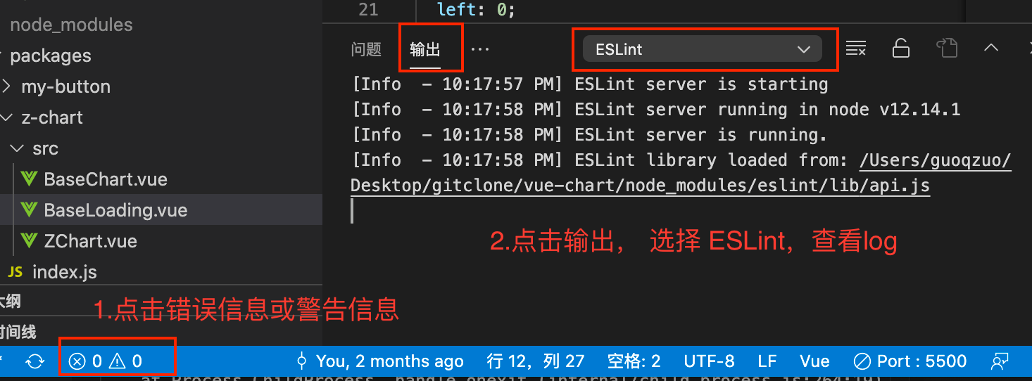 - 点击 vscode 右下角的错误信息、警告信息图标,看是信息里是否有 eslint 相关报错