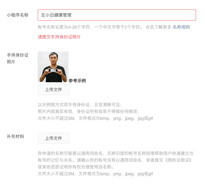现在稍微通用一点的关键字,比如包含 "管理" 两个字,可能会要求你提供上传手持身份证的照片,而且还要有对应的商标证书。如下图: